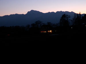 2009-12-2の満月の出。振り返れば、同日の太陽が沈んだばかりの南アルプスが聳えています。 |