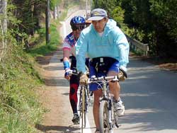 | 清里大橋で記念写真。最後の心臓破りの坂に備えます。いや、キツそう・・。 | |