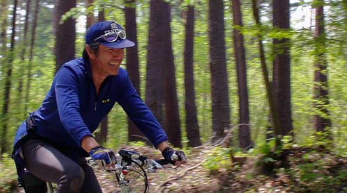 | 新緑の森を駆け抜けるこのイベントの仕掛け人。仕事中には決して見せない笑顔でしょう(^_^;)。実はかなりの勾配を上っています。カメラを向けたら笑顔を作ってくれました。それでは以下にコ−ス案内を。 | |