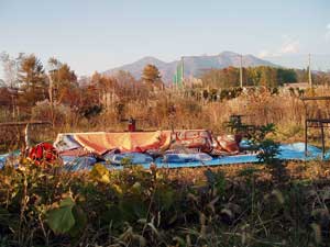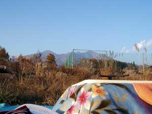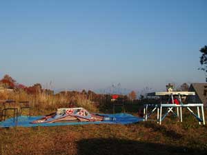 そこに、こんな風にコタツやらテ−ブルやらをセットするのです。 正面は東です。秩父山脈の金峰山、小川山などが地平線に浮かんでいます。 ほぼ遮るものがなく、地平から星が昇ってくるところが雄大に見えます。 |