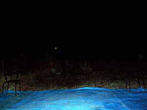 深夜腹をおさえつつ後片付けをしていたら昨日下弦だった月が昇ってきた。赤味がかった二十四夜の月は、少しおどろおどろしい。 あわてて撮ったのがこの程度。すいません。 でもほとんど仰角なく撮れる場所だということがわかりますでしょ。 青いのはブル−シ−トです。 |