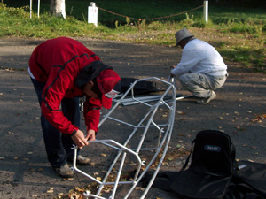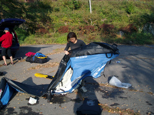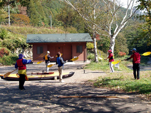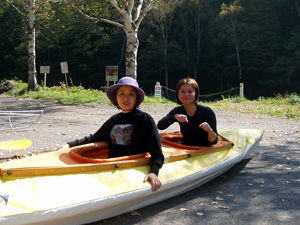 | 湖畔の駐車場でカヤックの組立て開始。トイレもあるので安心です。今日ご参加の母子です。ヤル気充分。 | |