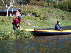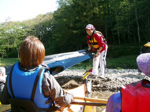 | 「沈」するのは100分の3くらいの確率ですなんていう講習を受けてイザ出発。川岸から滑るように出て行きます。 | |