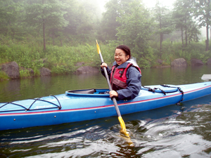| 本日の参加者は某紙の記者嬢。当然カヤック初体験。忙しい記者としては「今日しかないッ」と思って雨でも何でも突撃体験しにきた訳だろうが、怖いもの知らずとでも申しましょうか、突撃取材が身上なのか、「こんな天候でどうしましょうか?」というところが微塵もないのがイイ。気に入ったゼお嬢さん。そういう強い意志こそが天候をも左右させるのだ。「意思あるところ神に通ず」です。 | |