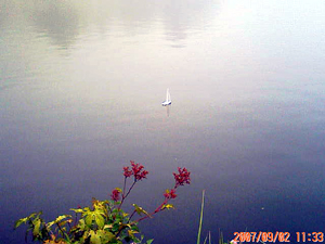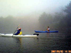標高1620mの湖水は「カヤック可能な日本一標高の高い水面」だ。眼下にヨットも浮かぶ(?)我が倶楽部の基地。残念ながら霧の濃い一日だったが、神秘的な雰囲気が○ |