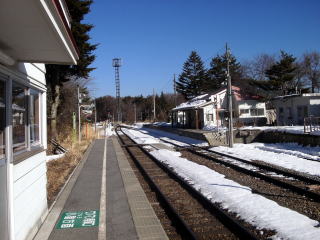 ホ−ムから見ると一層ひどい。 横から見た駅舎です。物置ですねこりゃ。こんなとこくぐって外に出ても観光客としては高原のム−ドを満喫できないだろうなぁ。 一言で言って「人を歓迎していない駅舎」の感があります。駅についた旅人を喜ばそうとか安堵感を与えようとか、旅情を誘おうとか、まるでなにも考えてませんね。 |
