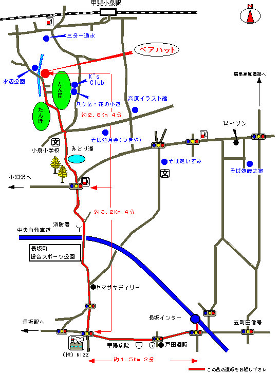 | 長坂ICの出口信号を右折→そこから2個目の信号「清光寺坂上」を右折(角はかなり鋭角で上り坂・視界が悪いので気をつけて下さい)→「自動車用品の店」(旧ヤマザキデイリー)のあるY字を 直進(上り坂)→GSのある変形五叉路は直進(坂を上る)→約2キロ走ると「小泉小学校北」の広い変形五叉路がありますのでここを左折します→すぐ30M程行って右折です (小泉保育園の前を通ります)→左右に田圃を見ながら上がってくるとつきあたり、橋のたもとに見えてきます。長坂ICから約12分です |