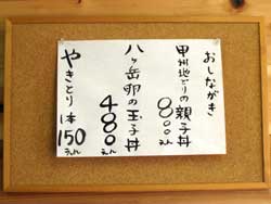 「宣伝広告費が出せないので自分で書いた」とおっしゃるが、自信があるので書いたとおもわれます。いや〜、いい味出してます。 ニワトリはすべて平飼いで、愛情を持って育てているのがよく分かります。 お奨めは「親子丼」 手塩にかけたニワトリと卵を料理しちゃうのです(~_~;) 泣かせます。 |