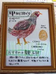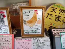 店内はこだわりの品々がこだわりのPOPに紹介されて、なんだか独特の雰囲気が・・・。 ニワトリと一口に言っても種類は多ござんして・・ そのちくいちを絵解きで説明してあります なんともいえないトリの姿と表情は、この家の奥様手書きのPOPでございます。 |