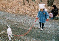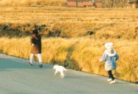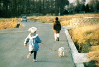 しかし、梨絵ちゃんは私との始めての散歩がたまらなく嬉しいとみえて、お姉ちゃんからヒモを奪い取ると、「新しいご主人様」ぶりを発揮するのでした。ちょっとヒモが脚にからんじゃったりして歩きにくいんですけどね、梨絵ちゃんじゃ。 お父さんも「梨絵がヒモ持ってご覧!」なんて言うんですよ。やだなあ。 |