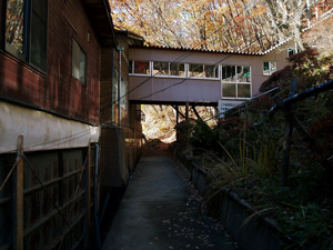 それはともかく、細い道を入っていくと、まずは金泉閣の温泉へ続く渡り廊下の下を潜ります。 すると・・・。 |