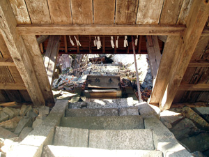 この小屋は祭神様を拝む為の小屋なのです。東屋神社といって、日本武尊と弟橘姫命、木花咲耶姫命が祭神です。美しい姫神様が二人もおられるじゃありませんか、これは御参りしなければ、といってもあまりにも急な崖の上の祠なので、石段からではとても行けません。 そこで鉄の橋が掛けられていたのを利用したのですが、中はこんな風になっていました・・・。 |