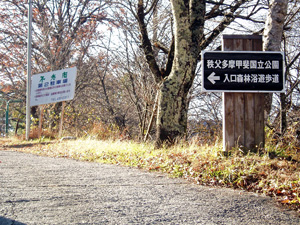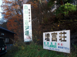 さて、案内を続けましょう。少し先に行くとこんな看板が見えてきます。 縦に長い方の看板をご覧下さい。写真の腕が悪くてすみませんが「森林浴遊歩道入口」と書かれています。 「増富荘」というのは廃業してますが、建物はそのままになっています。入り口はその増富荘の前から入って行くのです。 |