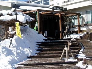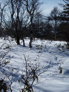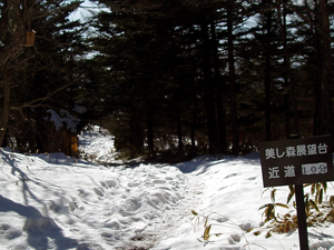 清里駅方面から上って来た場合、美し森の交差点を過ぎてそのまま直進します。 サンメドウズスキー場の方向へ進むと約1キロで左へ入る道があります。そこを曲がると「美し森ファーム」(旧たかね荘)です。冬期はここから歩き始めるのがベストなのです。 左折する角に「鹿鍋」やら「チーズケーキ」やらの看板が目だっているのですぐ分かります。 |