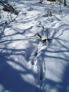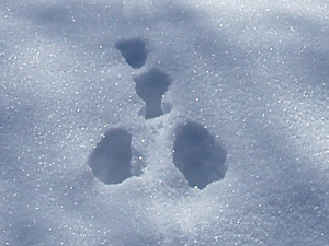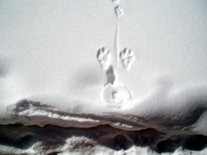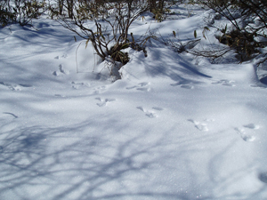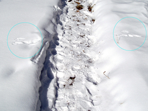 そこで、前後の状況をよく観察してみると 踏み固められた道を挟んでウサギの足跡が残っていることが分かります。 ははぁ〜ん、ウサギ君はここをジャンプして通ったのですね、そこで着地の時にお尻がチョコンと雪面についてしまったという訳です♪ こんな風に動物達の痕跡から彼らの行動や生態を推理して楽しむのが「アニマルトラッキング」です。 |