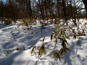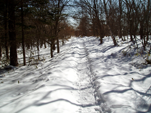 道は踏み固められていますので、 スノーブーツ或いは長靴でもOKです。スノーシューで歩く場合は道の両側の雪面を歩けば快適です。 | ||||||||