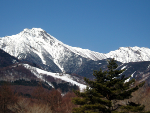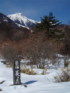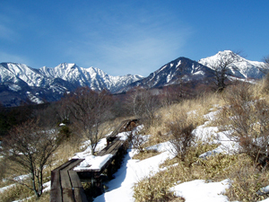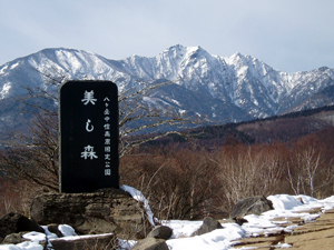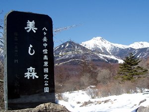 まそれはともかく、 帰り道も素晴らしい展望です。樹林の向こうに赤岳。梢からこぼれる青空。 晴れた冬の一日、誰も来ない散歩道と展望は貴方だけの貸切となります。 冬の魅力の「雪景色と青い空と山岳展望」を、これほどダイナミックに、しかも山岳の間近で魅せてくれる場所はそうありません。 是非一度散歩に訪れてみてください。 |