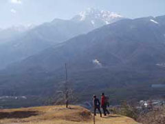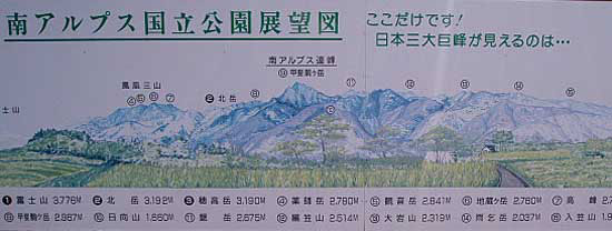 | 「三峰」と書いて「さんぽう」と読む。ここから眺める三方に日本の高峰一位から三位が見えるという丘だ。東南に日本一の富士山、南に第二位の北岳、西北に第三位の奥穂高が聳えてい る。奥穂高は遠くて小さく、よほど条件の良い日でないと見えませんが。 | |||||||||||