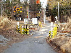 大滝湧水公園近くの踏切。JR中央本線の線路沿いに左折する。大型車は渡れない。 大都会新宿を出た列車も、ここまで来ればこんな踏み切りを越えて走るのだと思うとなんだか愉快。 |