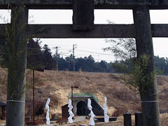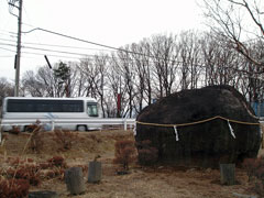 向こうを走る中型バスと比べて下さい。 ちなみに高さ5メートル、周囲15メートル、重さ90トンということです。 この岩へ篠竹を立てて供物を捧げたことから、物供石とも神供石とも呼ばれています。 |