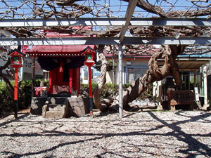 さらに進むと、小さなお稲荷様を見つけた。「正一位稲荷大明神」とあった。 私はてっきり長坂駅前がまだ「狐山」と呼ばれていた頃の由緒あるものかと思ったが、駅前発展の頃に集まった人々が、自分達の心のより所として祀ったそうだから、歴史はそう古くない。しかし境内の藤の木は見事である。樹齢100数十年。その脇には如何にも古そうな秋葉社の祠があった。 |