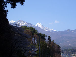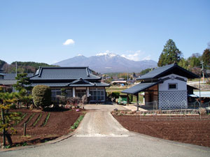 正面の山が清光寺の林である。 私達も狐火を追って清光寺へ向かう。小高い丘の頂上に寺へ向かう急な坂道がある。ここを降りる(右折)。 このあたりの景色は抜群。金峰山、富士山、八ケ岳と四方大絶景である。これだけ開けた風景ではさすがに狐火ももう行くところがないのか、清光寺から先へ行った話は伝わっていない が |