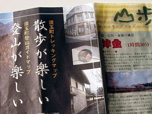 「須玉町トレッキングマップ 散歩が楽しい 須玉町登山ガイドマップ 登山が楽しい」と書かれたなかなかしゃれたマップです。皆様も事前に手に入れて歩きましょう。読み物としても楽しく出来ています。北杜市役所か須玉支所の観光課に連絡すれば送ってくれるでしょう。 |