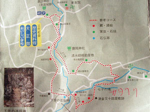 今回のコースのタネを明かせば、このマップに載っている右側の地図をそのまま歩いてみたのです。三代校舎から約90分の町並探検のコースです。 |